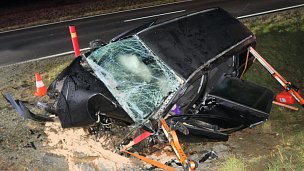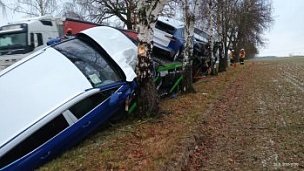 Hasiči zasahují na silnici I/20 v katastru obce Libějovice u nehody nákladního auta převážejícího osobní vozy. Auto se převrátilo do příkopu a opřelo o stromy. Vodňanská jednotka na místě řeší únik cca 100 litrů nafty a přečerpání cca 1000 litrů nafty z nádrží do sudů.