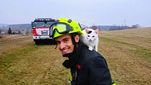 Výška přes deset metrů a již dvě mrazivé noci – zachráněná kočka se u Sepekova zatím ještě tolik neusmívá jako její zachránce Dominik, ale věříme, že záchranu brzo docenila.